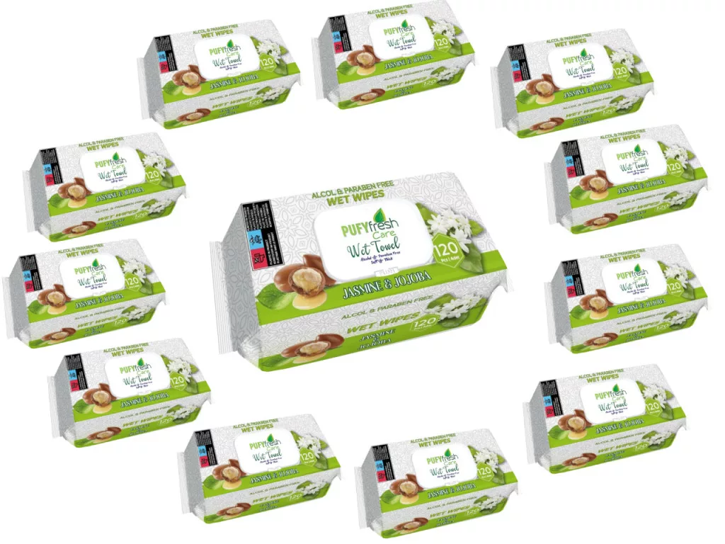 Élvezd a hosszan tartó frissességet és gazdaságos kiszerelést a Pufy Fresh jázmin és jojoba illatú nedves törlőkendő 12 darabos csomagjával! A 120 darabos kendőcsomagok egyenként praktikus, visszazárható fedéllel rendelkeznek, így hosszú ideig megőrzik nedvességüket. A jázmin- és jojoba-kivonatok gyengéden ápolják a baba bőrét, friss illatot és természetes tisztaságot biztosítva – alkoholtól és parabénektől mentesen.